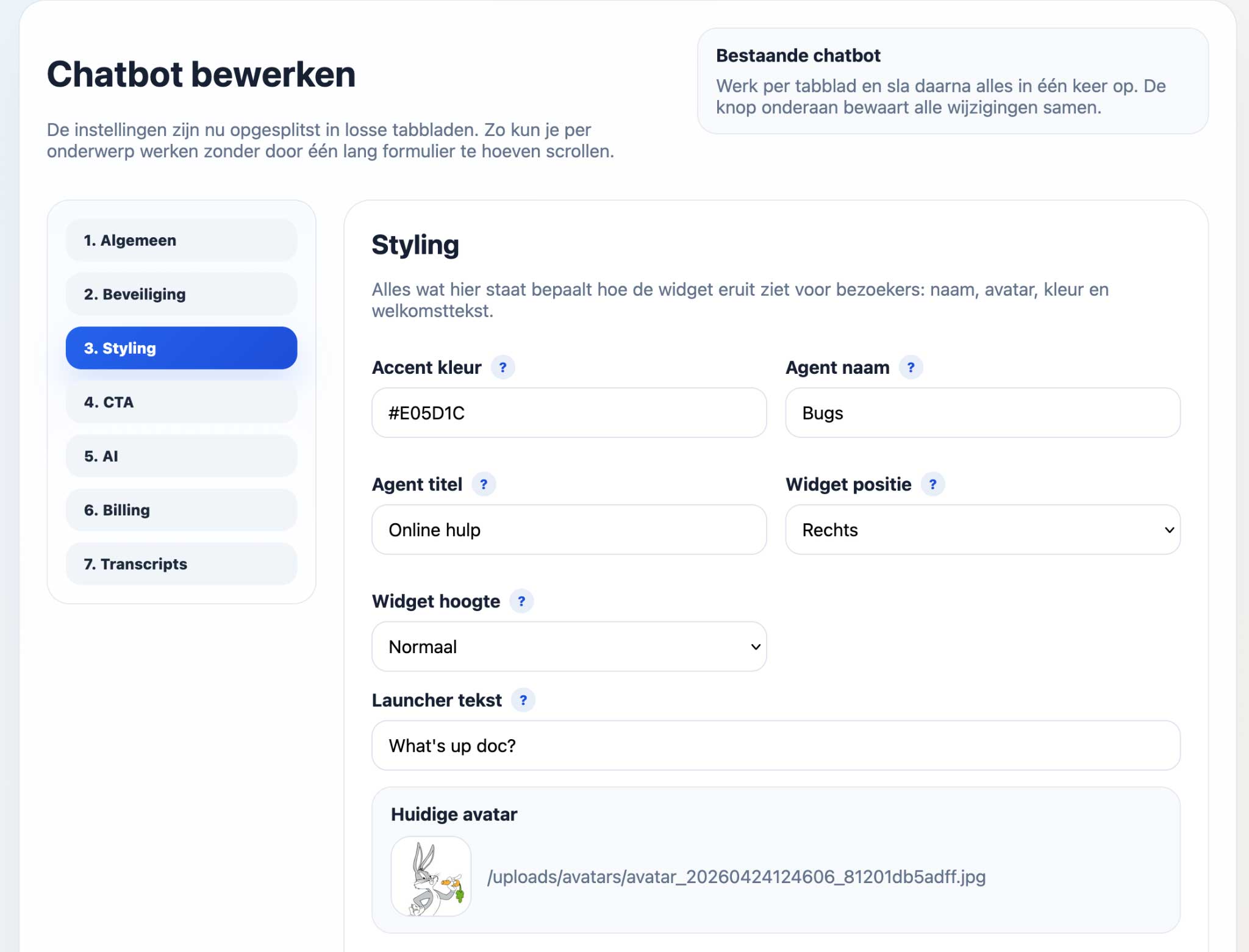 De uitstraling van Bugs is ook instelbaar. Denk aan de accentkleur, naam van de agent, titel, positie van de widget, hoogte en avatar. Voor Web Rabbitz gebruiken we natuurlijk onze eigen stijl. Maar als Bugs straks ook op andere websites draait, kan de widget worden aangepast aan de huisstijl van die website. Dat maakt hem niet alleen functioneel, maar ook netjes geintegreerd in het ontwerp.